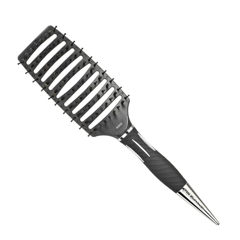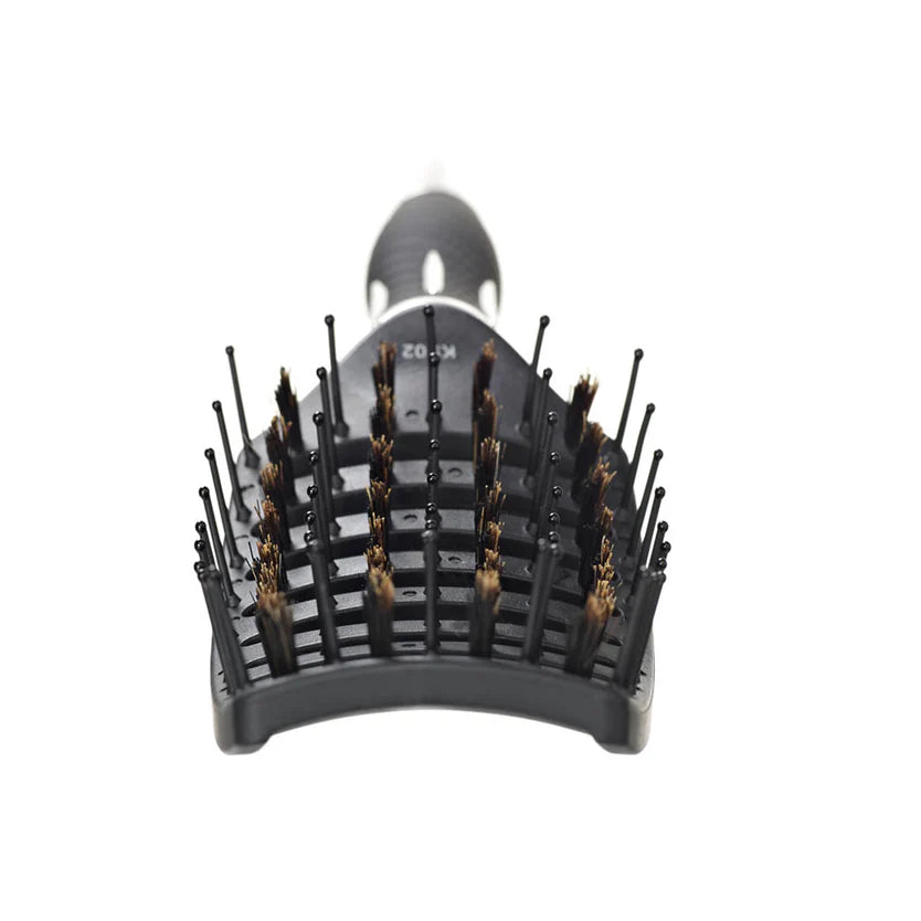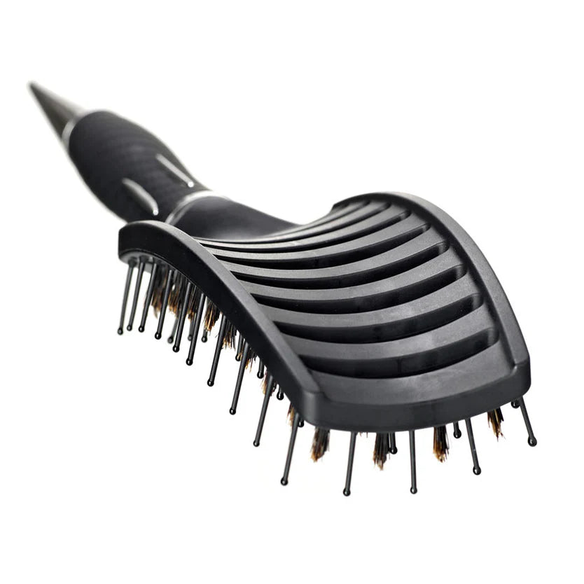 A sculpted head featuring 50 moulded flexible tufts in a curved and vented chassis. The brush's arch follows the head's natural shape for a soothing brushing experience. 10 additional rows of natural boar bristle have been added to smooth, clean and add shine to the hair.