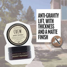 Anti-gravity volume powder with matte finish Give hair lift, thickness and a matte finish with American Crew Boost Powder. This weightless powder adds grit for dramatic, gravity-defying texture. And, it can be layered with virtually any other American Crew styling product.