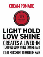 Cream pomade with light/medium hold and low shine. A moisture-rich cream pomade that provides a natural look while taming hair leaving a low shine finish.
