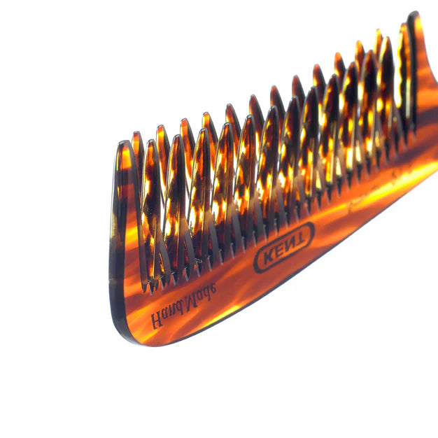 Kent Handmade Combs are renowned for their excellent quality. Each comb is hand-sawn from large sheets of cellulose acetate rather than moulded and have rounded teeth, ensuring a smooth and comfortable action. The result is a comb that glides effortlessly through the hair without scratching or damaging the hair or scalp.