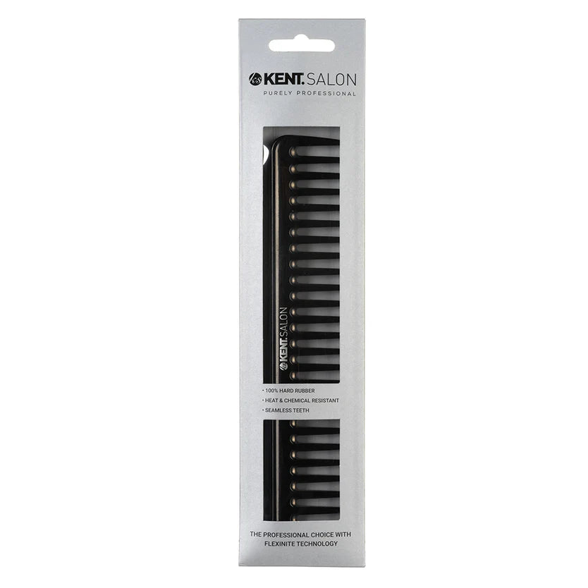 Wide tooth styling comb. Hand-finished, hard rubber comb contains seamless teeth to ensure they are gentle on the hair and scalp and cause no cuticle damage. FLEXINITE technology ensures the combs can endure high heat and be resistant to chemicals.